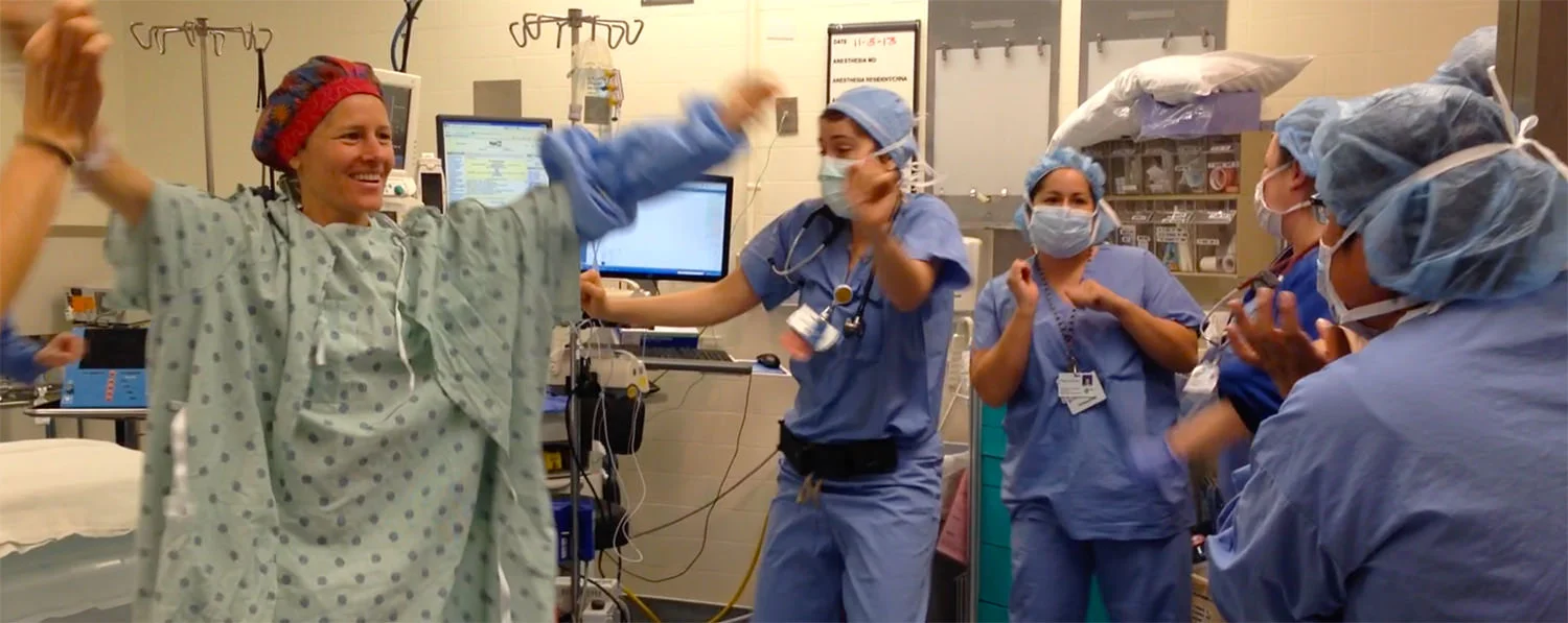 “After I was diagnosed with breast cancer, my fantasy was for my friends and family to join me virtually while I danced in my little hospital gown and bouffant cap in the Mt. Zion operating room with the team before my double mastectomy. I asked my family and friends to play Beyonce's "Get Me Bodied" and dance wherever they happen to be the morning of my surgery. I wanted to feel my community's energy just prior to surgery, I wanted to bring my full, joyful, open self to the operating room, I wanted to connect with my OR team using my favorite medium, DANCE, and I wanted to watch videos of my friends and family dancing while recovering after surgery.
